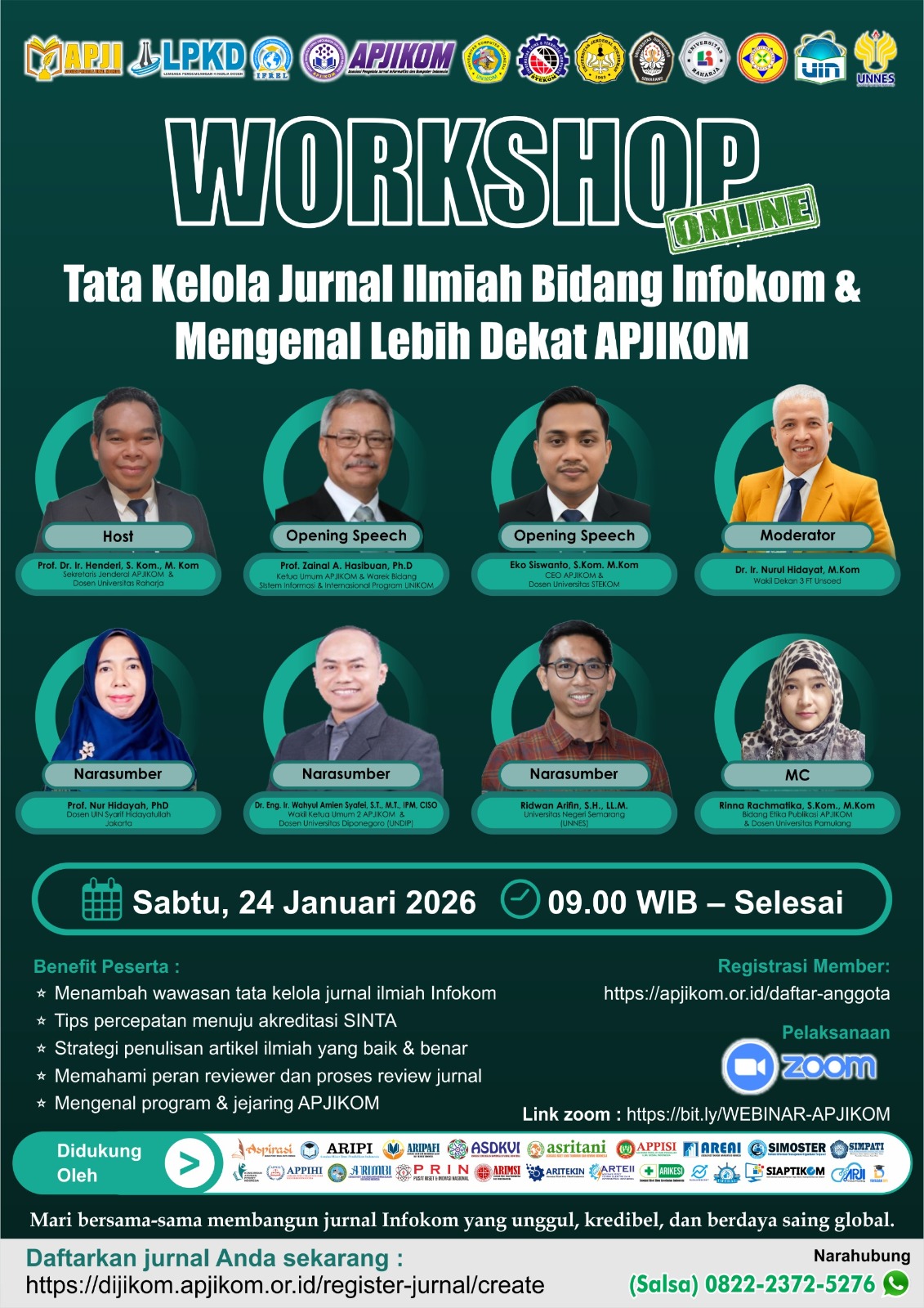EDUTECHID.COM — Asosiasi Pendidikan Tinggi Ilmu Komunikasi (APJIKOM) kembali menunjukkan komitmennya dalam meningkatkan kualitas pengelolaan jurnal ilmiah bidang Informasi dan Komunikasi (Infokom) melalui penyelenggaraan Workshop Online “Tata Kelola Jurnal Ilmiah Bidang Infokom & Mengenal Lebih Dekat APJIKOM”, yang akan dilaksanakan pada Sabtu, 24 Januari 2026, mulai pukul 09.00 WIB hingga selesai secara daring melalui Zoom Meeting.
