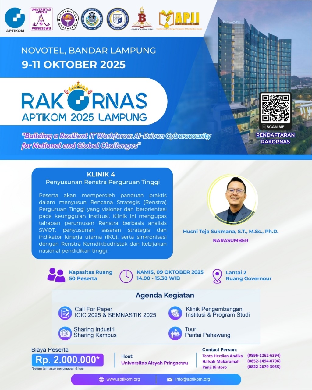 Bandar Lampung, 9 Oktober 2025 — Rangkaian kegiatan Rapat Koordinasi Nasional (Rakornas) Asosiasi Pendidikan Tinggi Informatika dan Komputer (APTIKOM) 2025 di Hotel Novotel Bandar Lampung berlanjut dengan pelaksanaan Klinik 4: Penyusunan Rencana Strategis (Renstra) Perguruan Tinggi.