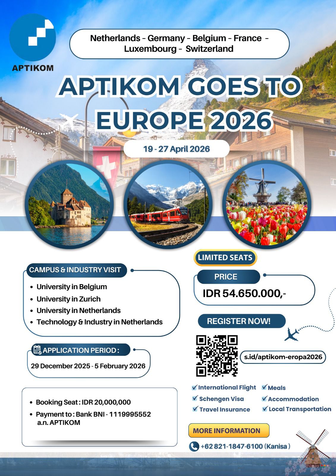 Pendaftaran program APTIKOM Goes to Europe 2026 dibuka mulai 29 Desember 2025 hingga 5 Februari 2026, dengan kuota peserta terbatas. Peserta diwajibkan melakukan booking seat (uang muka) sebesar Rp20.000.000,-, dengan pembayaran melalui Bank BNI nomor rekening 111 999 555 2 atas nama APTIKOM (Cabang Perintis Kemerdekaan Bandung).
