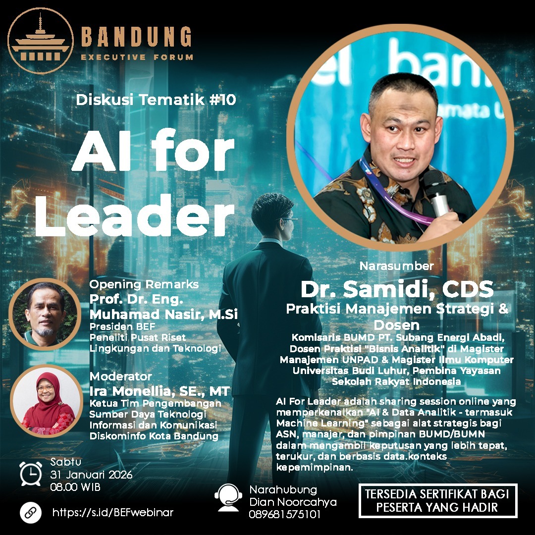 Bandung — Dalam rangka meningkatkan kapasitas kepemimpinan di tengah pesatnya transformasi digital, Bandung Executive Forum (BEF) akan menyelenggarakan Diskusi Tematik #10 bertajuk “AI for Leader”. Kegiatan ini dijadwalkan berlangsung secara daring pada Sabtu, 31 Januari 2026, mulai pukul 08.00 WIB.