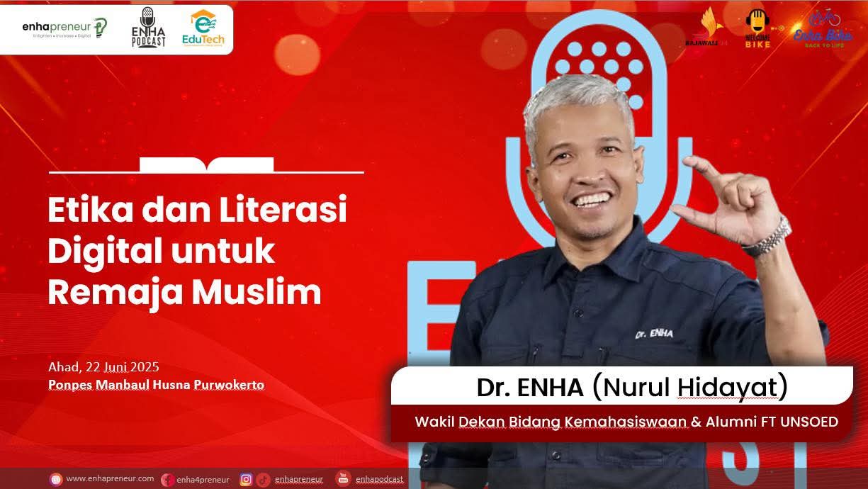 Kegiatan ini menghadirkan Dr. ENHA (Nurul Hidayat), Wakil Dekan Bidang Kemahasiswaan dan Alumni Fakultas Teknik Universitas Jenderal Soedirman (FT UNSOED), yang dikenal aktif dalam dakwah digital dan edukasi teknologi melalui platform Enhapreneur dan Enha Podcast.