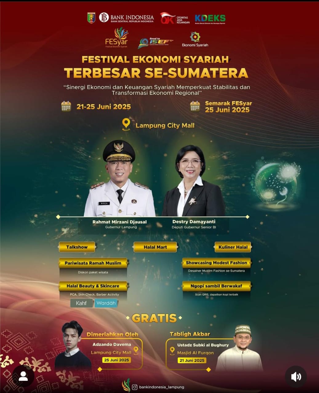 Bandar Lampung, 20 Juni 2025 – Bank Indonesia bersama Komite Daerah Ekonomi dan Keuangan Syariah (KDEKS) Provinsi Lampung serta Otoritas Jasa Keuangan (OJK) menggelar Festival Ekonomi Syariah (FESyar) Terbesar Se-Sumatera di Lampung City Mall pada tanggal 21 hingga 25 Juni 2025. Acara ini merupakan bagian dari rangkaian menuju Indonesia Sharia Economic Festival (ISEF) dan bertujuan memperkuat stabilitas serta transformasi ekonomi regional berbasis syariah.