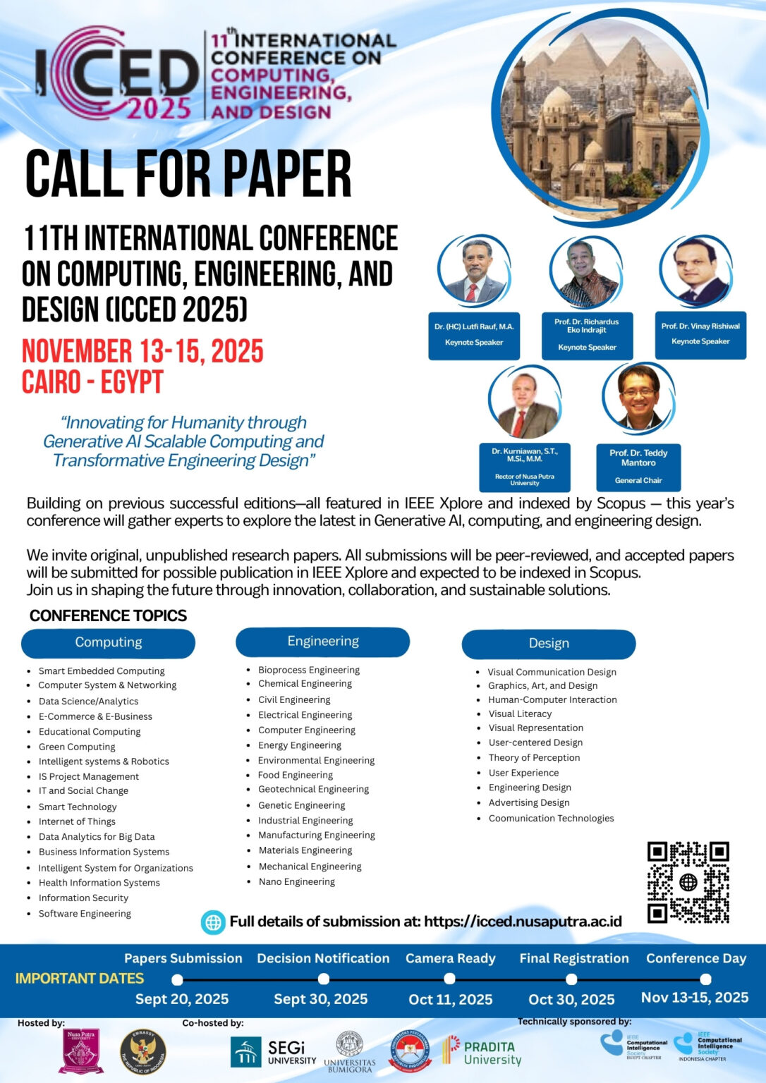 Kairo, Mesir – The 11th International Conference on Computing, Engineering, and Design (ICCED 2025) siap digelar pada 13–15 November 2025 di Kairo, Mesir. Dengan mengusung tema “Innovating for Humanity through Generative AI, Scalable Computing, and Transformative Engineering Design,” konferensi ini akan menghadirkan pakar dunia untuk mengeksplorasi perkembangan mutakhir di bidang kecerdasan buatan generatif, komputasi, dan desain rekayasa.