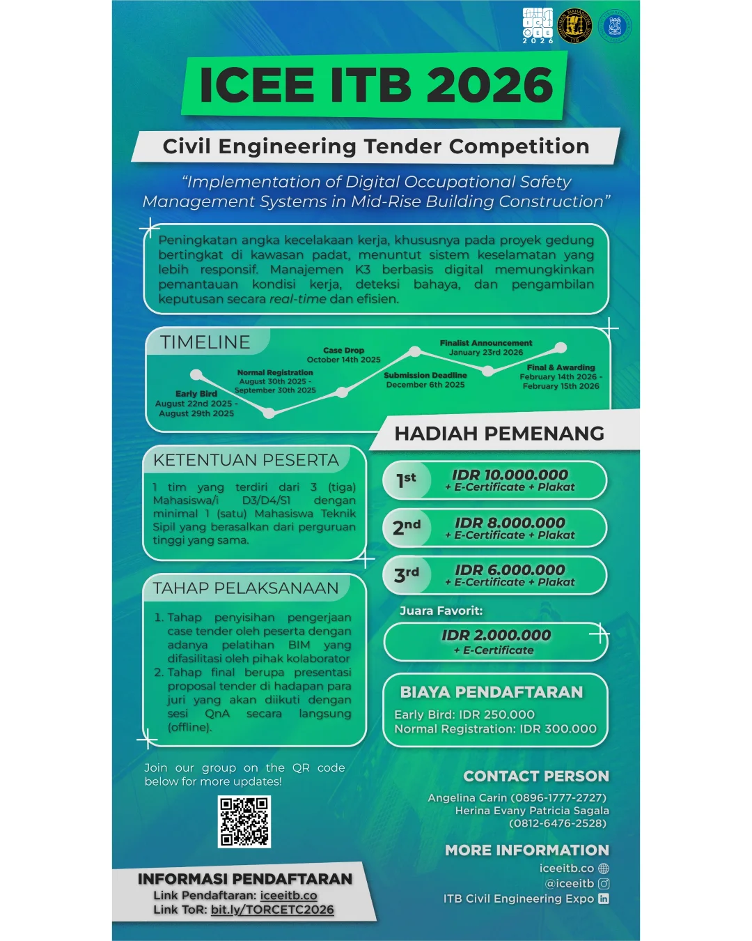 Informasi lengkap mengenai Terms of References (ToR) dapat diakses melalui bit.ly/ToRCompeICEE26, sementara pendaftaran resmi dilakukan melalui laman www.iceeitb.co.