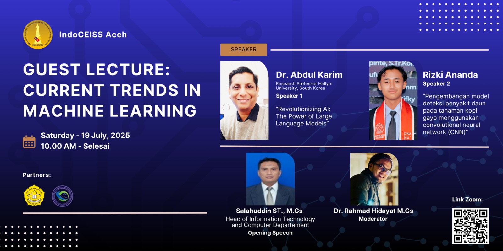 BANDA ACEH — IndoCEISS Aceh akan menyelenggarakan kuliah tamu bertajuk "Current Trends in Machine Learning" pada Sabtu, 19 Juli 2025, mulai pukul 10.00 WIB hingga selesai. Kegiatan ini menjadi salah satu forum akademik yang mengangkat isu-isu terkini di bidang kecerdasan buatan dan pembelajaran mesin (machine learning), dengan menghadirkan pakar internasional dan peneliti muda nasional.