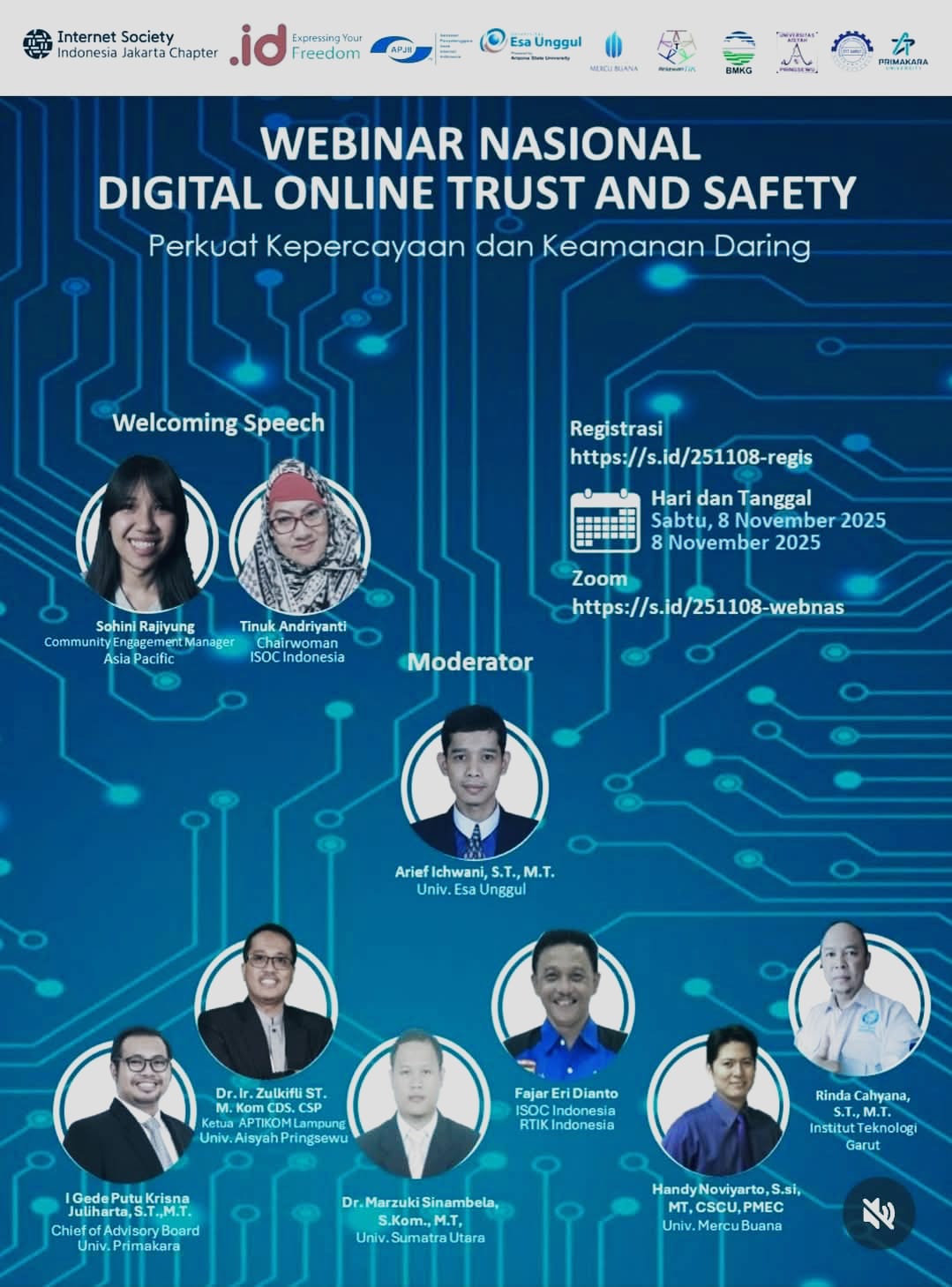 Acara akan diawali dengan sambutan dari Sohini Rajiyung, Community Engagement Manager Asia Pacific Internet Society (ISOC), serta Tinuk Andriyanti, Chairwoman ISOC Indonesia. Keduanya akan menekankan pentingnya literasi digital dan tanggung jawab bersama dalam menciptakan ekosistem internet yang aman, inklusif, dan terpercaya.