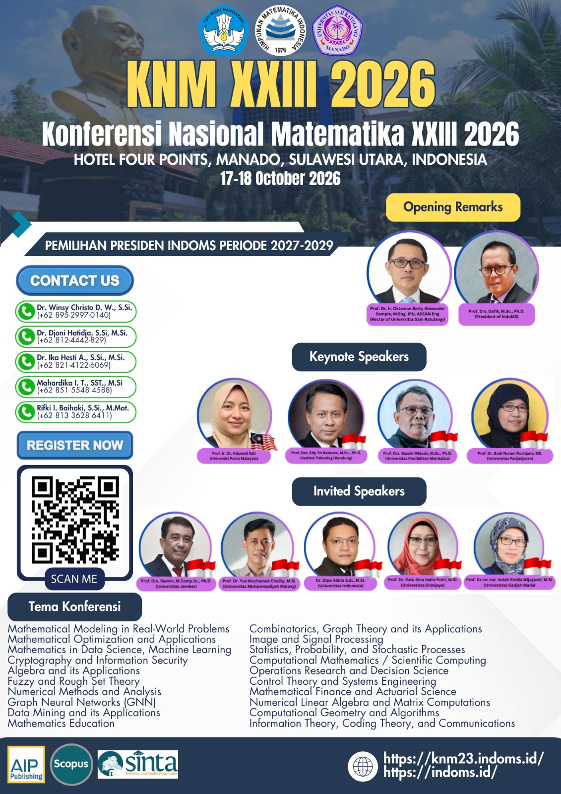 Manado — Himpunan Matematika Indonesia (Indonesian Mathematical Society/IndoMS) akan menyelenggarakan Konferensi Nasional Matematika (KNM) XXIII Tahun 2026 yang dijadwalkan berlangsung pada 17–18 Oktober 2026 di Hotel Four Points, Manado, Sulawesi Utara. Kegiatan ilmiah nasional ini menjadi forum strategis bagi para akademisi, peneliti, praktisi, dan mahasiswa untuk berbagi gagasan, hasil penelitian, serta perkembangan terbaru dalam bidang matematika dan aplikasinya.