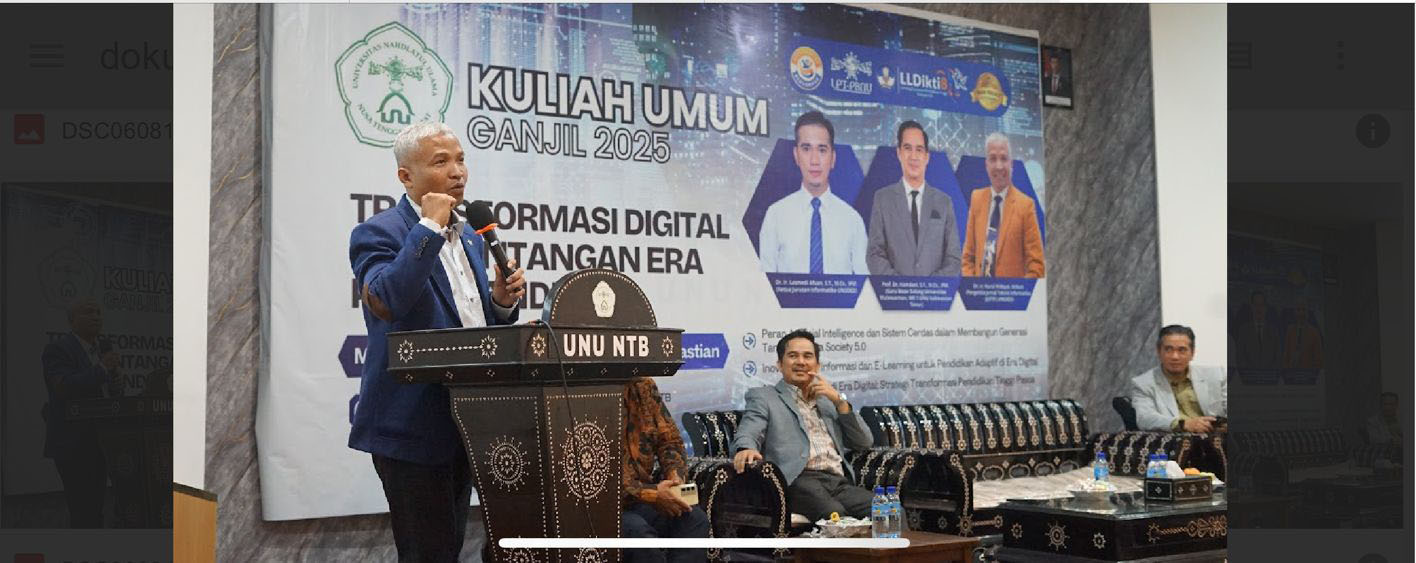 Mataram, 11 September 2025 – Universitas Nahdlatul Ulama (UNU) Nusa Tenggara Barat sukses menyelenggarakan Kuliah Umum Ganjil 2025 dengan tema “Artificial Intelligent for Education: Transformasi Digital dan Tantangan Era Post-Pandemi, Mengukir Masa Depan di Tengah Ketidakpastian”. Acara yang berlangsung di Aula UNU NTB tersebut diikuti ratusan mahasiswa dan civitas akademika dengan penuh antusiasme.