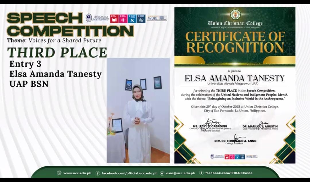 PRINGSEWU, Prestasi membanggakan kembali ditorehkan oleh mahasiswa Universitas Aisyah Pringsewu (UAP). Elsa Amanda Tanesty, mahasiswi Program Studi S1 Keperawatan semester 5, berhasil meraih Juara 3 dalam ajang Speech Competition yang diselenggarakan oleh Union Christian College (UCC), La Union, Filipina.