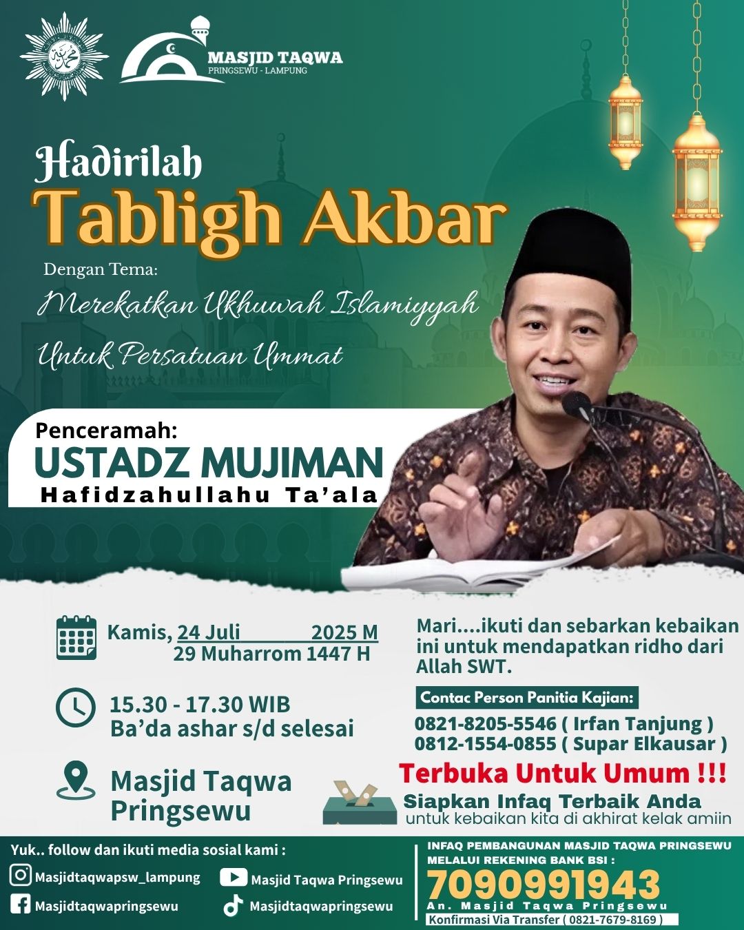 PRINGSEWU, 24 Juli 2025 — Dalam upaya mempererat ukhuwah Islamiyyah dan membangun persatuan umat, Masjid Taqwa Pringsewu, Lampung, akan menyelenggarakan kegiatan Tabligh Akbar dengan tema "Merekatkan Ukhuwah Islamiyyah untuk Persatuan Ummat".