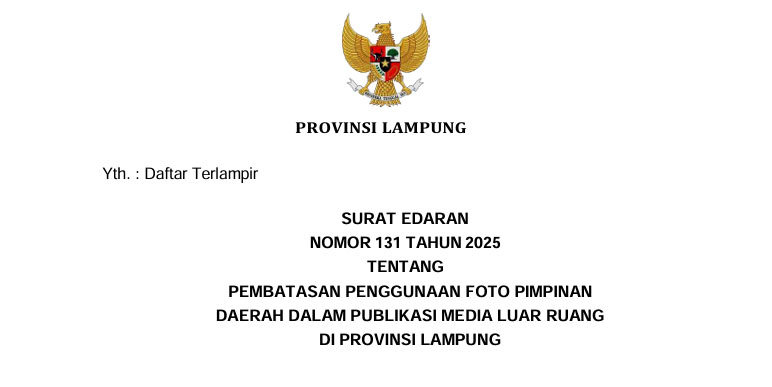 Bandar Lampung – Pemerintah Provinsi Lampung menerbitkan Surat Edaran Nomor 131 Tahun 2025 tentang Pembatasan Penggunaan Foto Pimpinan Daerah dalam Publikasi Media Luar Ruang. Edaran ini diterbitkan sebagai tindak lanjut atas arahan Kementerian Dalam Negeri Republik Indonesia melalui SE Nomor 000.9.3.3/6674/SJ mengenai penataan dan pemberian izin pemasangan reklame.