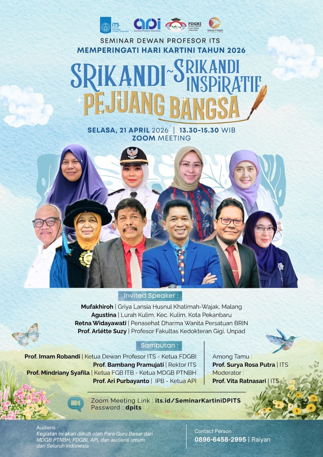 Kegiatan ini terbuka untuk para guru besar dari MDGB PTNBH, FDGBI, API, serta masyarakat umum. Peserta dapat mengikuti seminar melalui tautan Zoom di https://its.id/SeminarKartiniDPITS dengan passcode dpits. Selain itu, panitia juga menyediakan virtual background resmi yang dapat diunduh melalui https://its.id/VBKARTINI2026.