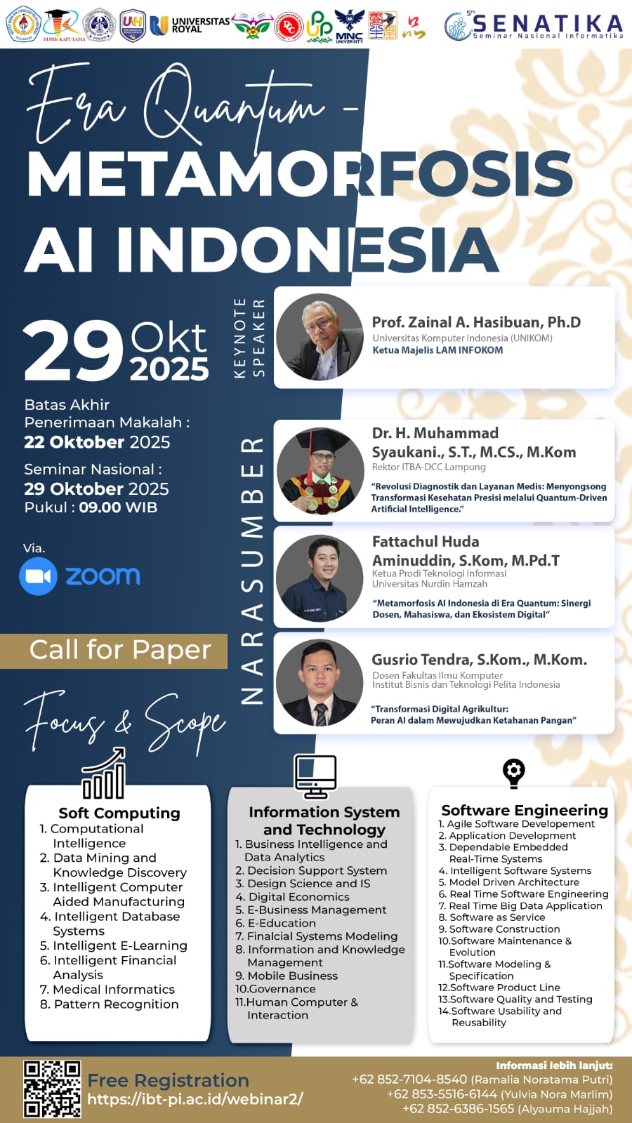 SENATIKA 2025 menghadirkan sejumlah tokoh akademisi dan pakar teknologi sebagai pembicara. Prof. Zainal A. Hasibuan, Ph.D. (Universitas Komputer Indonesia/UNIKOM), yang juga menjabat sebagai Ketua Majelis LAM INFOKOM, didapuk sebagai keynote speaker.