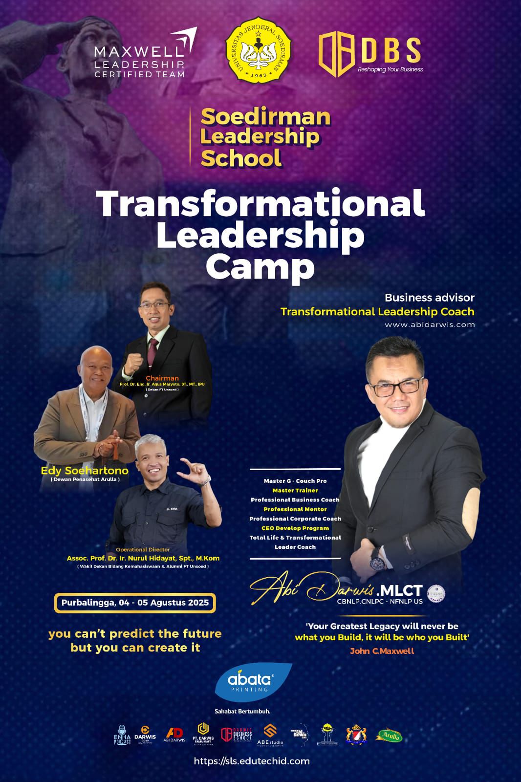 Transformational Leadership Camp menghadirkan narasumber utama Abi Darwis, MLCT, seorang Transformational Leadership Coach bersertifikasi internasional yang juga dikenal sebagai Master Trainer, CEO Developer, dan Business Advisor. Dalam salah satu kutipan inspirasinya, Abi Darwis menyampaikan, “Your greatest legacy will never be what you build, it will be who you built” – mengutip pemikiran John C. Maxwell.