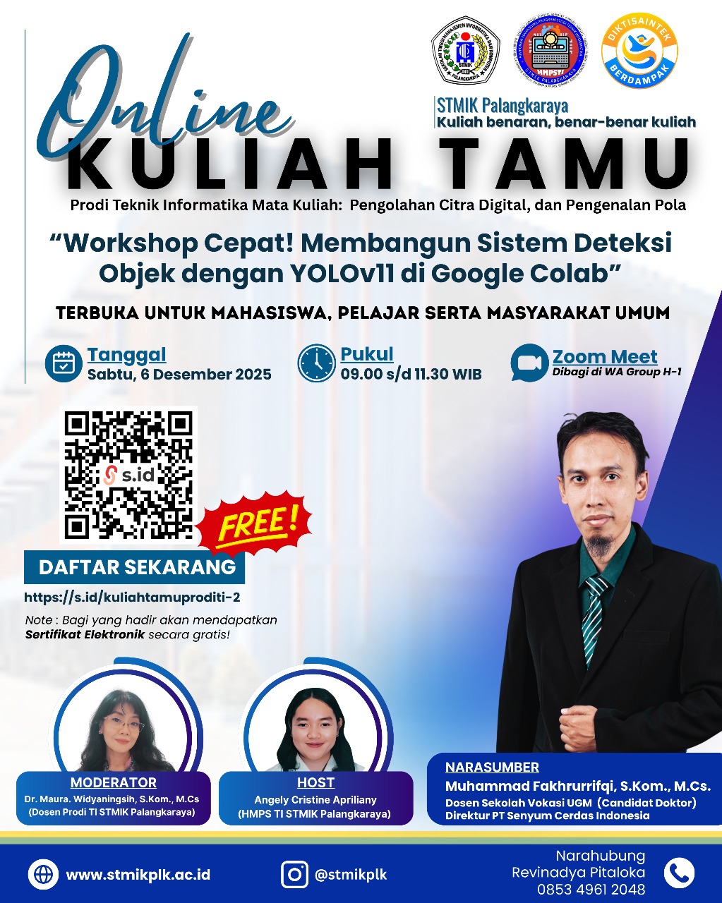Palangkaraya — Program Studi Teknik Informatika STMIK Palangkaraya bersama Himpunan Mahasiswa Program Studi Teknik Informatika (HMPS TI) akan mengadakan kegiatan Kuliah Tamu Online bertema “Workshop Cepat! Membangun Sistem Deteksi Objek dengan YOLOv11 di Google Colab.” Kegiatan ini dirancang untuk memperkenalkan konsep Computer Vision dan penerapan teknologi deteksi objek menggunakan algoritma terbaru YOLOv11.