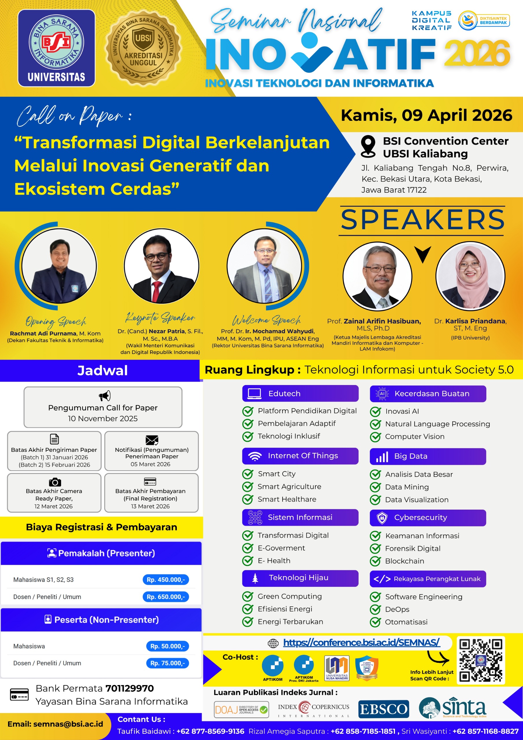 Dengan penyelenggaraan Seminar Nasional INOVATIF 2026, Universitas Bina Sarana Informatika berharap dapat berkontribusi nyata dalam mendorong inovasi teknologi dan informatika yang berkelanjutan serta berdampak positif bagi pembangunan bangsa. (*na)