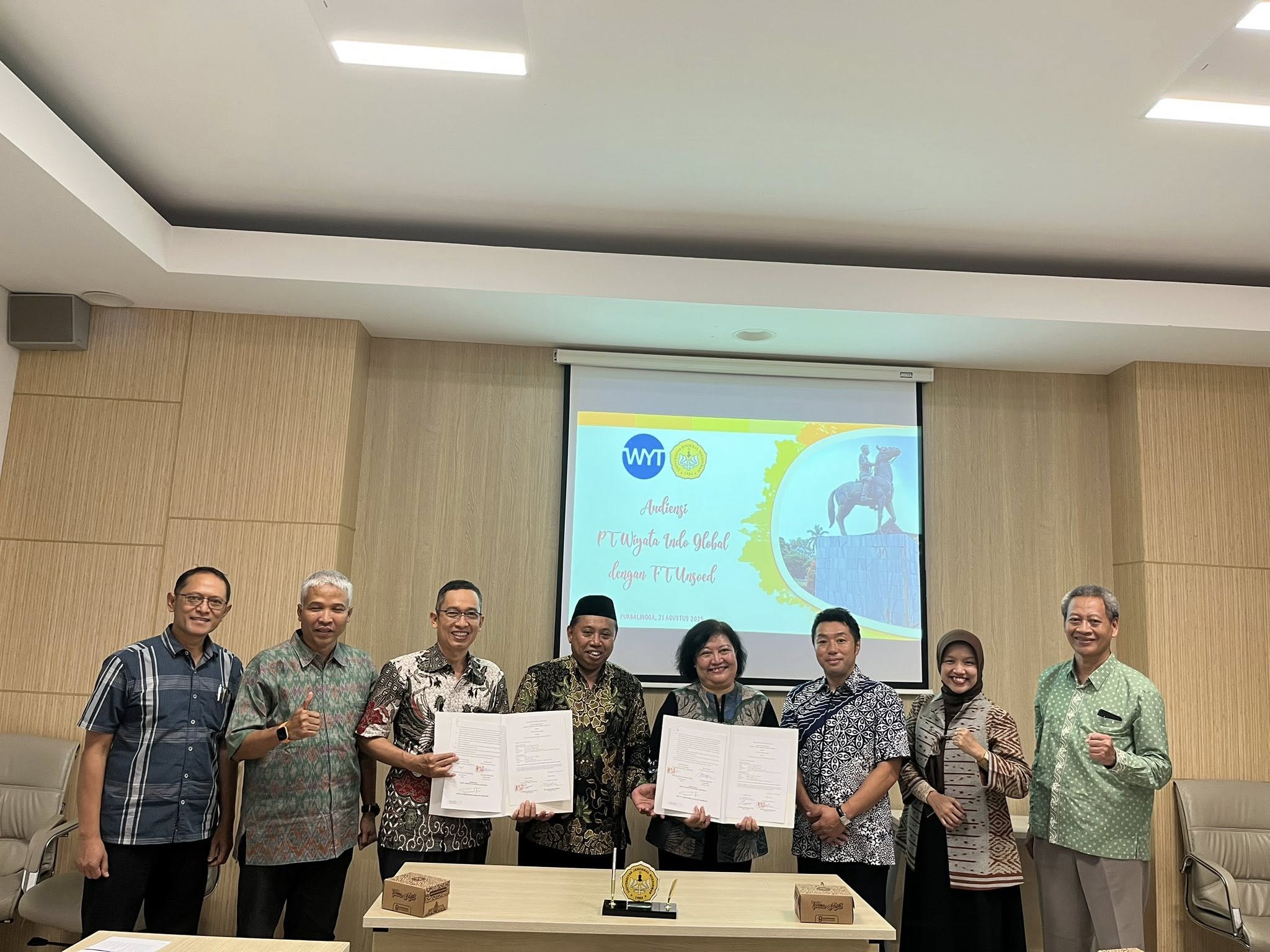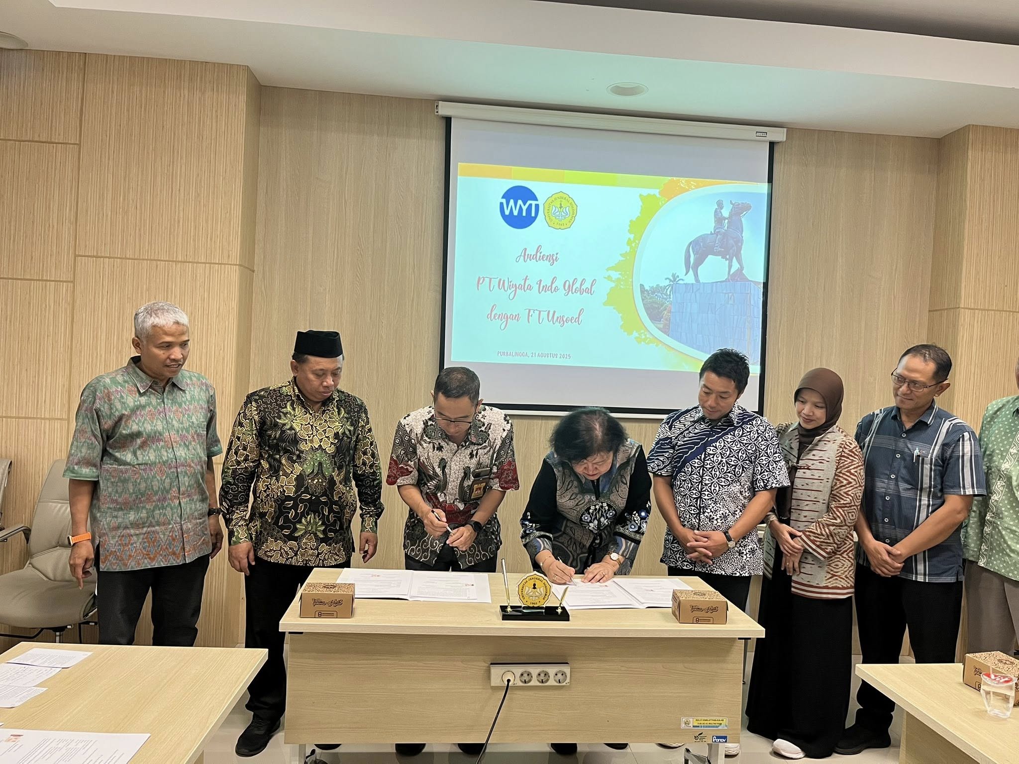 Purwokerto, 22 Agustus 2025 – Universitas Jenderal Soedirman (Unsoed) kembali memperluas jejaring internasional dengan menandatangani Nota Kesepahaman (MoU) bersama PT Wiyata Indo Global dan mitra dari Jepang. Penandatanganan dilakukan oleh Rektor Unsoed, Prof. Dr. Ir. Akhmad Sodiq, M.Sc.Agr, IPU., ASEAN Eng., didampingi Dekan Fakultas Teknik beserta jajaran, bersama Direktur Utama PT Wiyata Indo Global, Dr. Dewi Ariantini Yudhasari, S.S., M.Si.