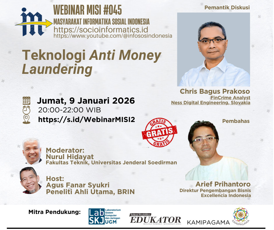 JAKARTA — Masyarakat Informatika Sosial Indonesia (MISI) kembali menggelar agenda diskusi ilmiah melalui Webinar MISI #045 yang akan mengangkat topik strategis “Teknologi Anti Money Laundering”. Webinar ini dijadwalkan berlangsung pada Jumat, 9 Januari 2026, pukul 20.00–22.00 WIB, dan dapat diikuti secara daring melalui platform Zoom.