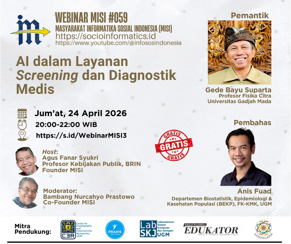 EDUTECHID.COM – Masyarakat Informatika Sosial Indonesia (MISI) kembali menggelar forum diskusi ilmiah melalui Webinar MISI #059 dengan mengangkat tema “AI dalam Layanan Screening dan Diagnostik Medis”. Kegiatan ini akan diselenggarakan pada Jumat, 24 April 2026, pukul 20.00–22.00 WIB secara daring melalui platform Zoom.