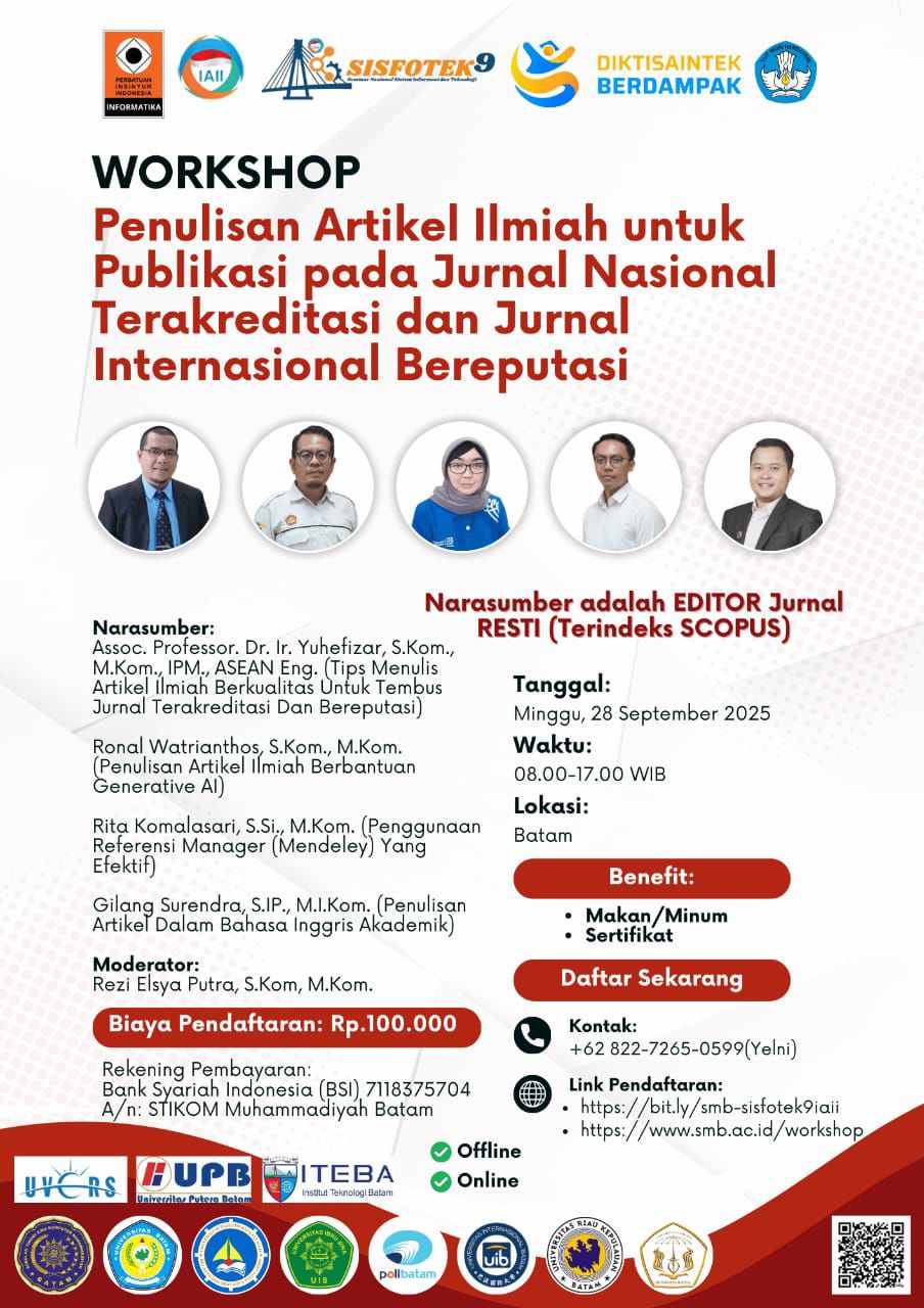 BATAM – Dalam rangka meningkatkan kualitas publikasi ilmiah dosen dan mahasiswa, STIKOM Muhammadiyah Batam bersama mitra perguruan tinggi menggelar Workshop Penulisan Artikel Ilmiah untuk Publikasi pada Jurnal Nasional Terakreditasi dan Jurnal Internasional Bereputasi. Kegiatan ini akan berlangsung pada Minggu, 28 September 2025, pukul 08.00–17.00 WIB, bertempat di Batam dan tersedia dalam dua pilihan metode, offline maupun online.